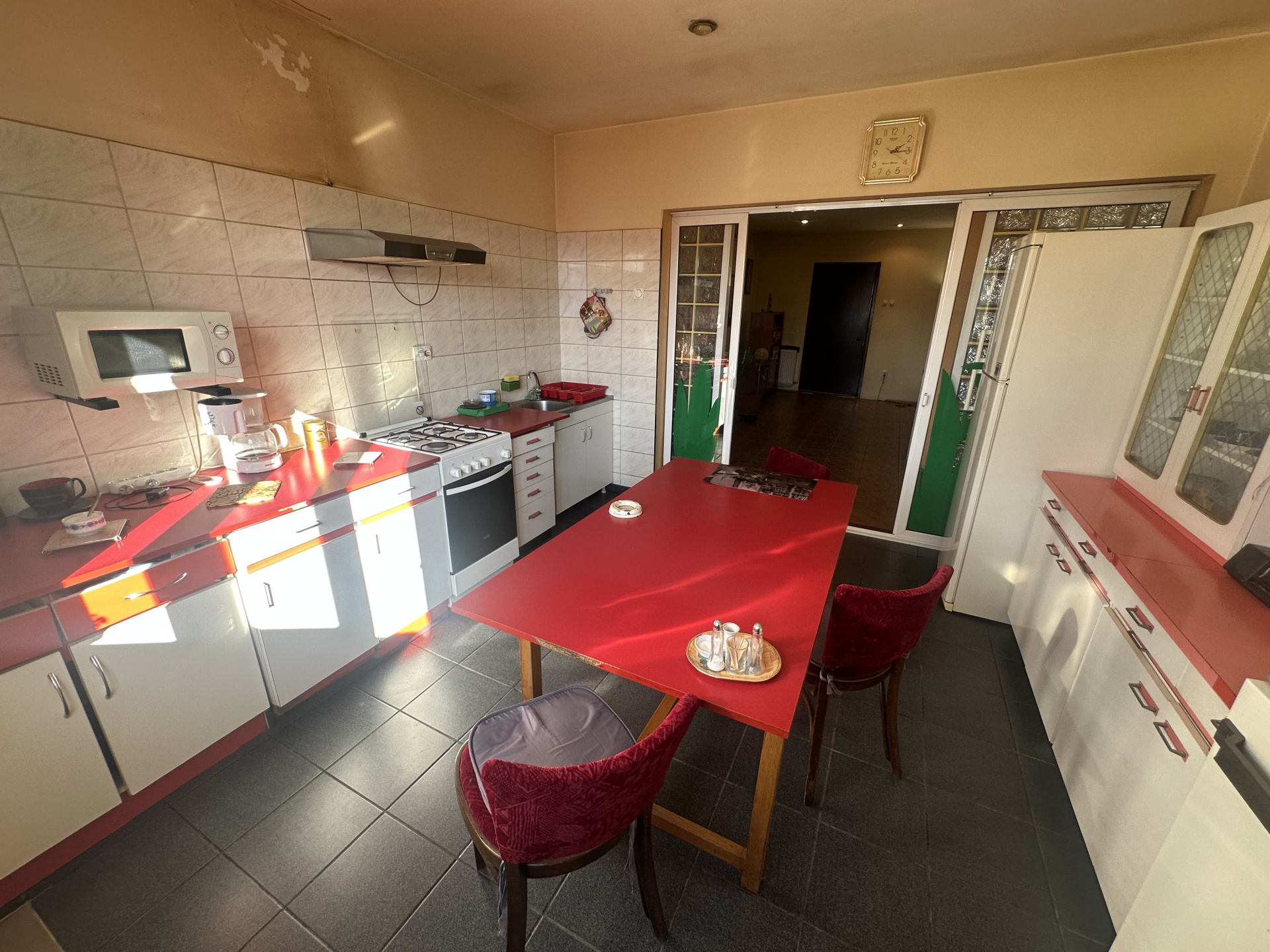 La etajul 1: Living cu terasa, bucatarie, 3 dormitoare, unul cu balcon, baie mare cu fereastra.
